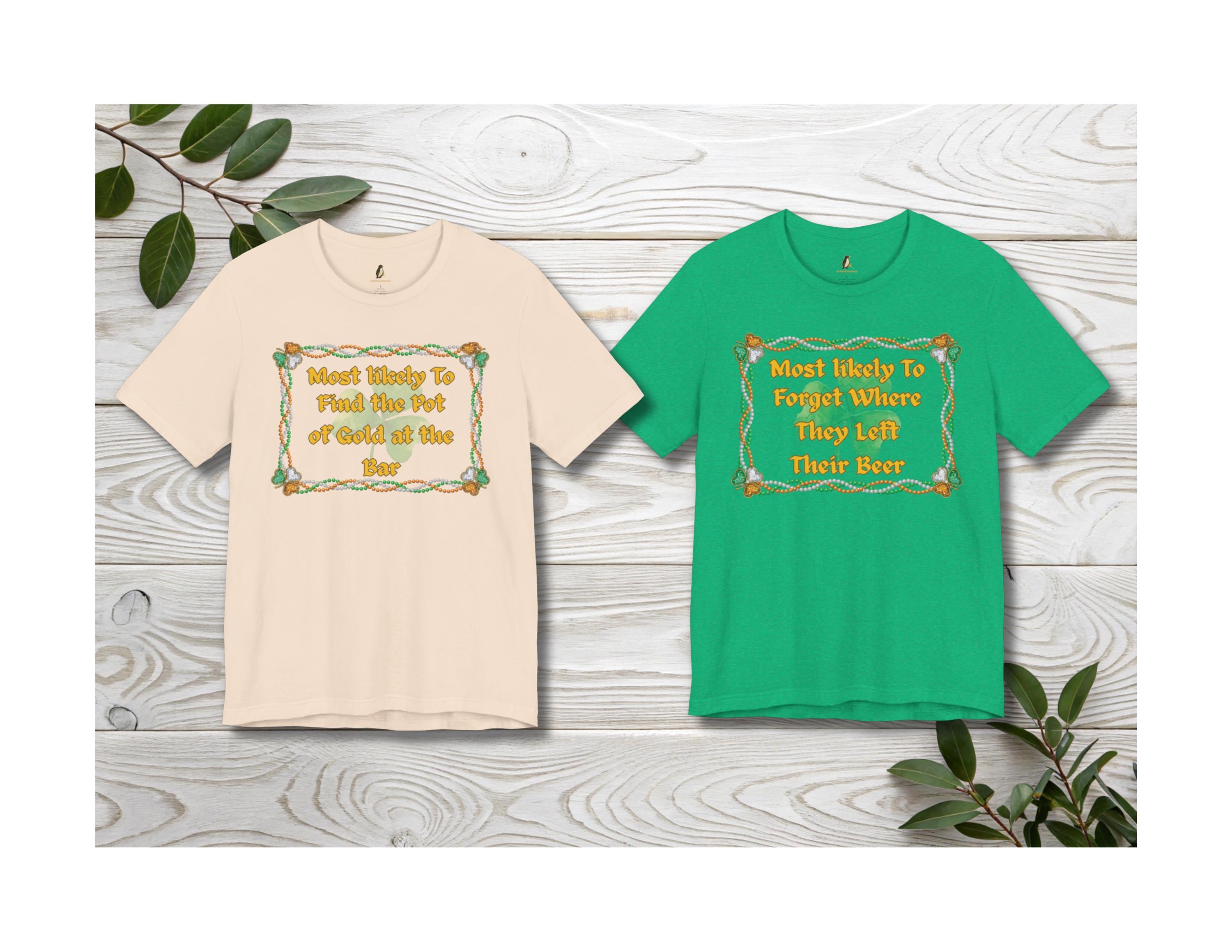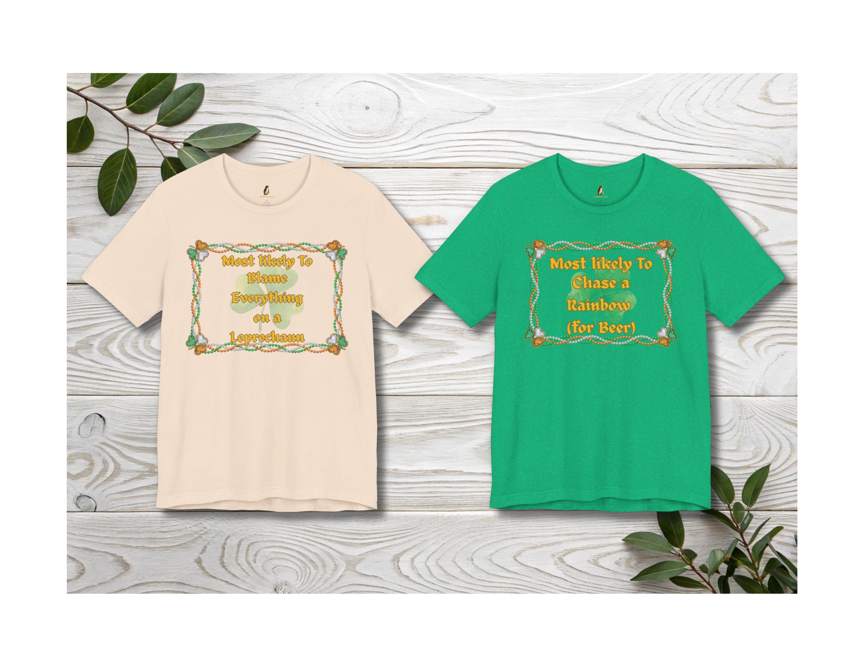 Celebrate the luck of the Irish and the fun of St. Patrick's Day with this unique "Most Likely To" t-shirt—it's sure to be a conversation starter and a favorite in your holiday wardrobe!