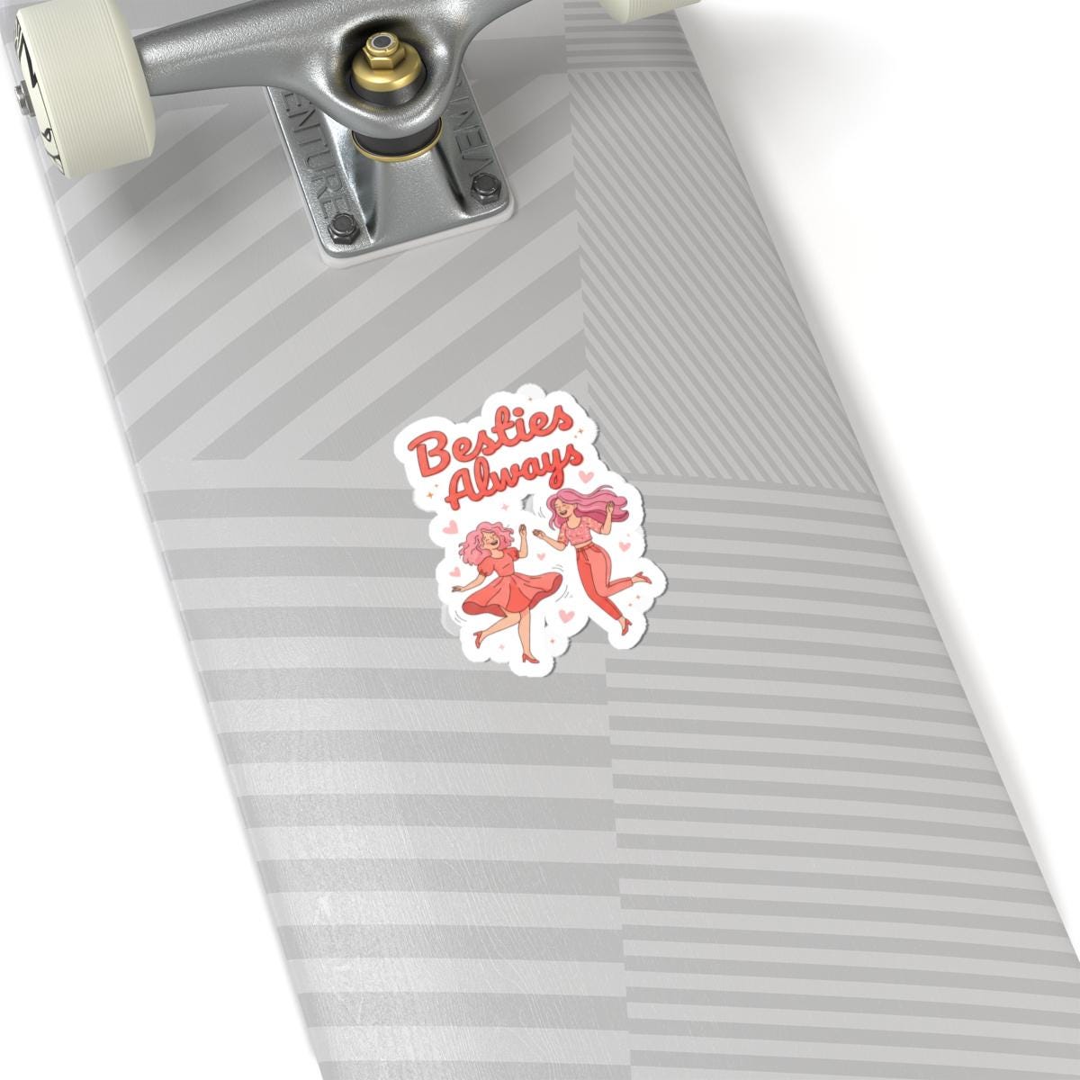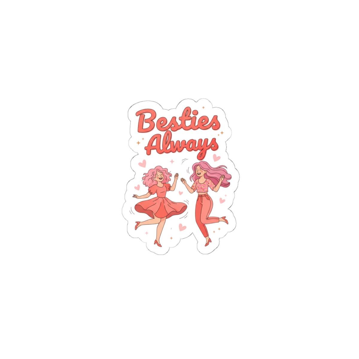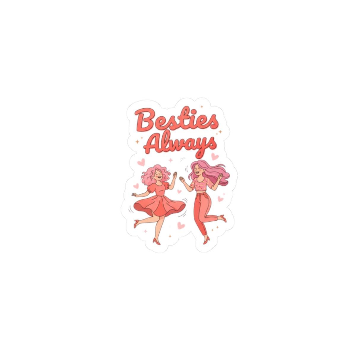 Playful, squad-ready kiss-cut sticker celebrating female friendship with a bright, brunchy Galentine’s vibe. The art shows two cheerful friends in saturated pink and coral tones with lively script reading “Besties Always,” making it a spot of upbeat affirmation for laptops, journals, and party favors. The glossy, vibrant finish and bubble-free application match the trend’s exuberant, supportive energy without romantic framing.