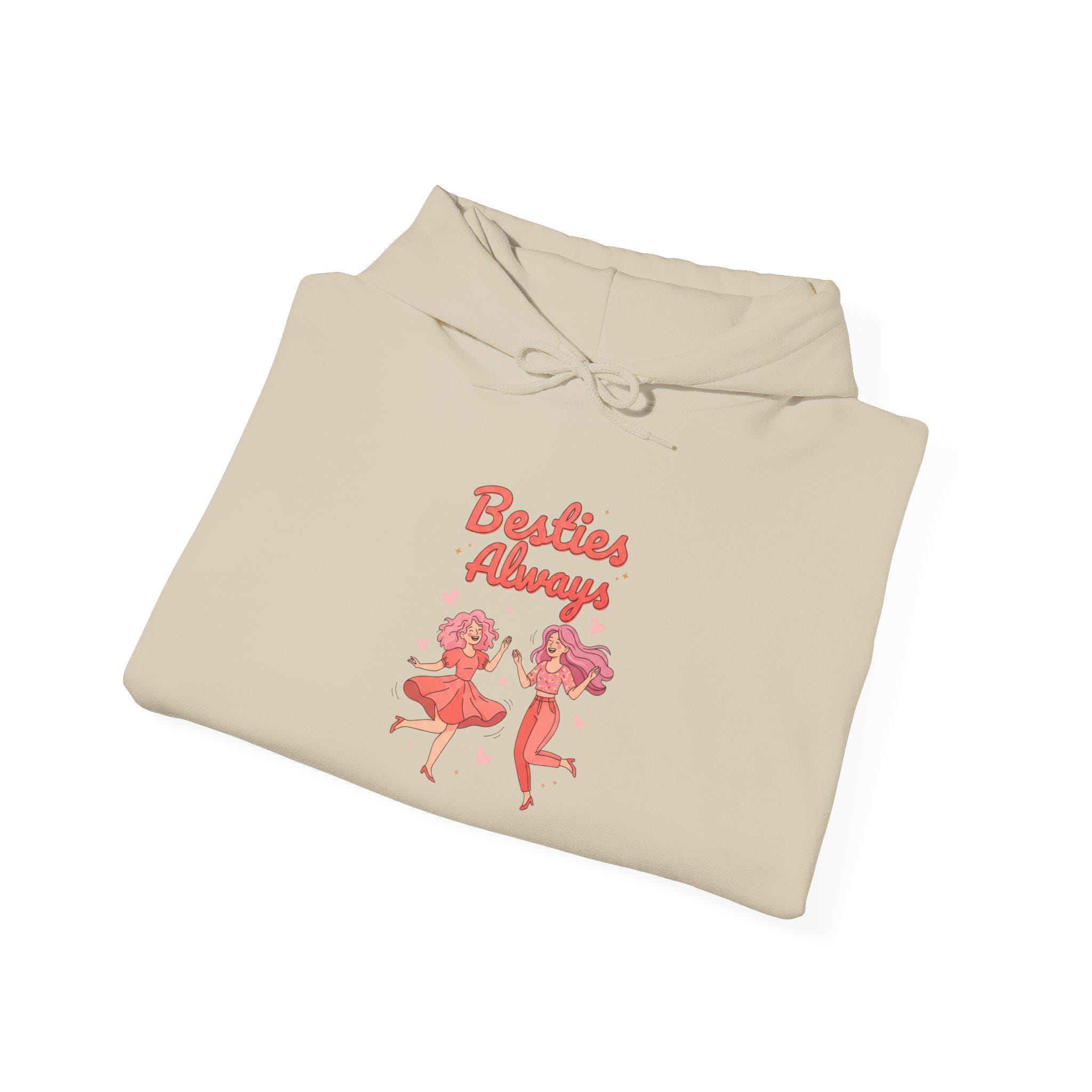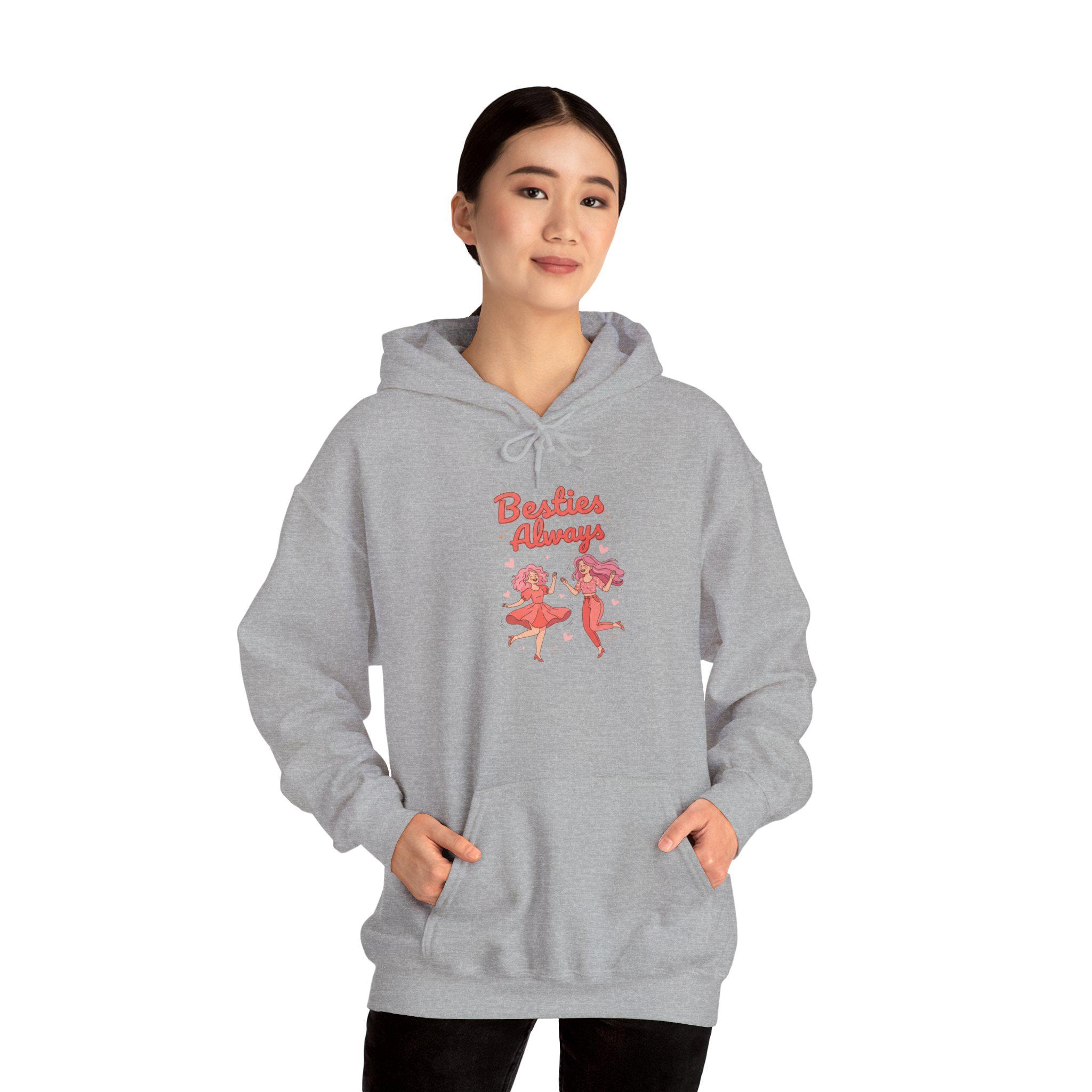 Bright, brunch-ready hoodie with playful, friendship-forward artwork in saturated coral and pinks that channels Galentine energy. The small chest illustration shows two joyful figures and upbeat script reading an affirmation about best friends, giving a casual, celebratory vibe that pairs with squad gatherings or neighborhood coffee runs. Lightweight-medium fleece and a classic fit make it comfortable for layered looks during early-February meetups or everyday wear for friend-focused wardrobes.