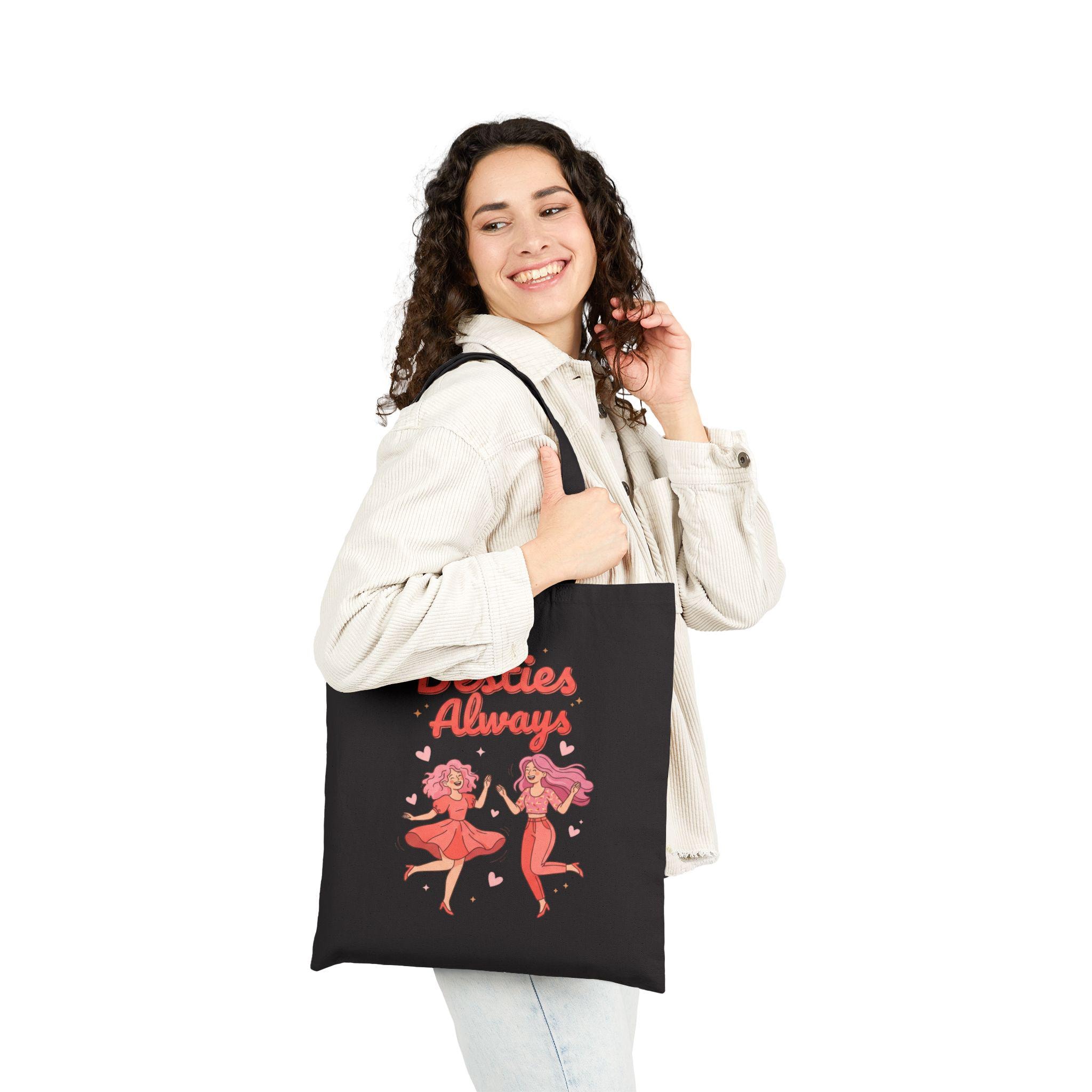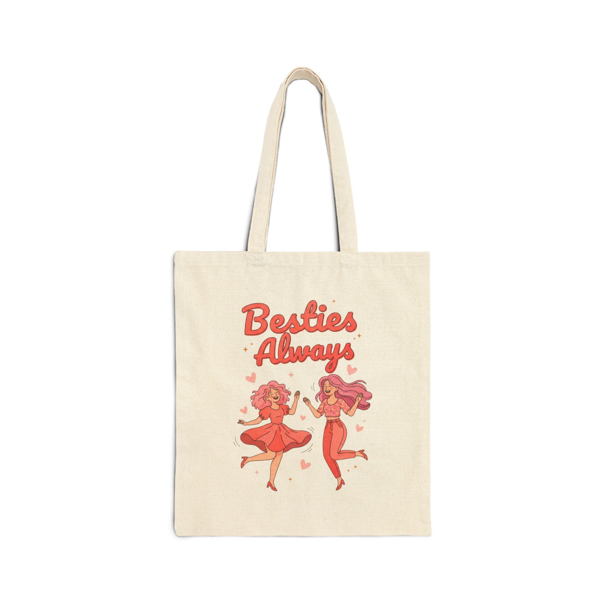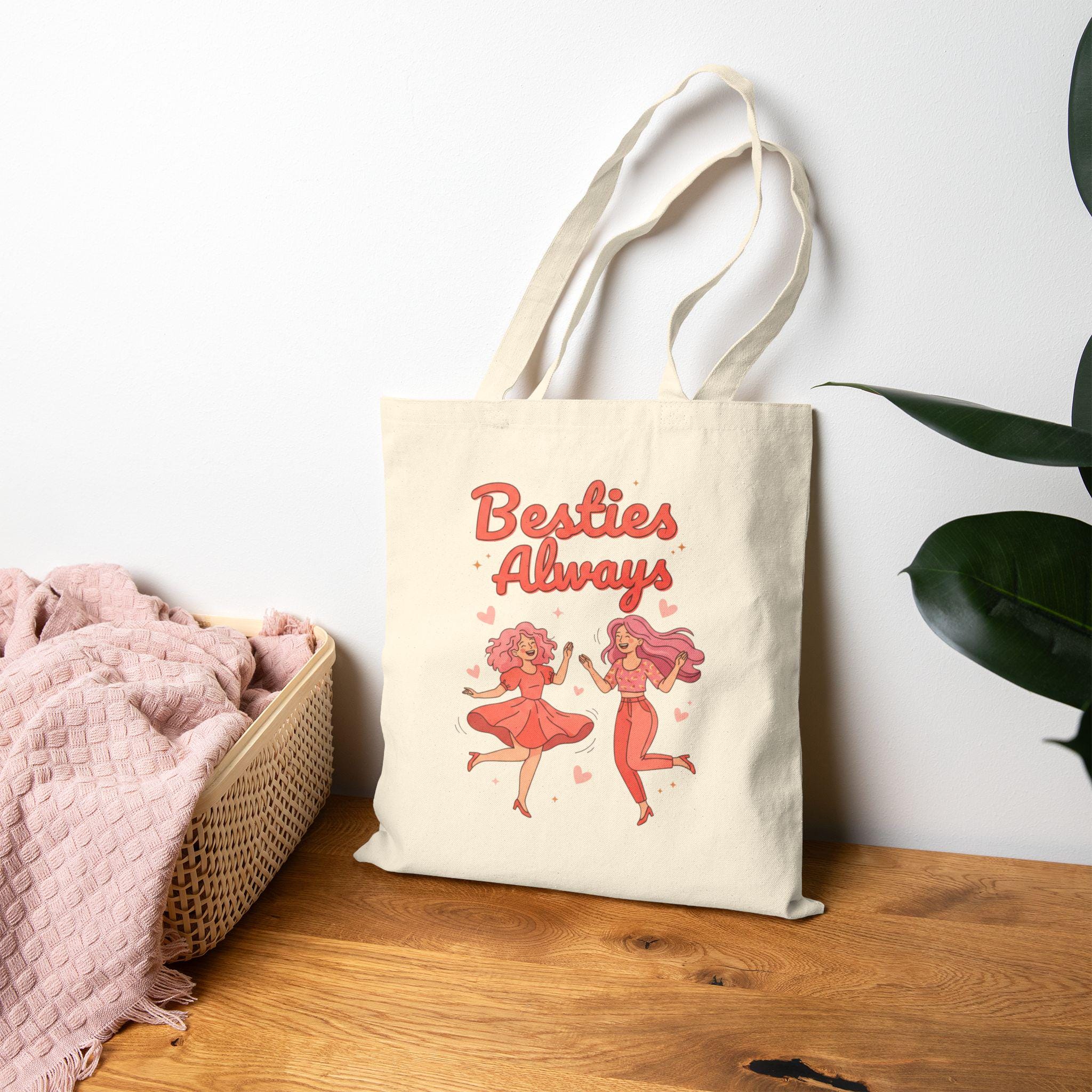 Bright, playful tote featuring a retro-inspired duo illustration and hand-lettered “Besties Always” script in saturated pinks and corals—an upbeat nod to Galentine’s camaraderie. The compact front-center print reads like a cheerful slogan, designed for brunch runs, errands, or matching-squad moments that celebrate female friendship without romantic framing. Lightweight to carry yet durable, it fits the “friendship-first” Galentine aesthetic with lively typography and cute character motifs that pair well with group merch and party-ready wardrobes.
