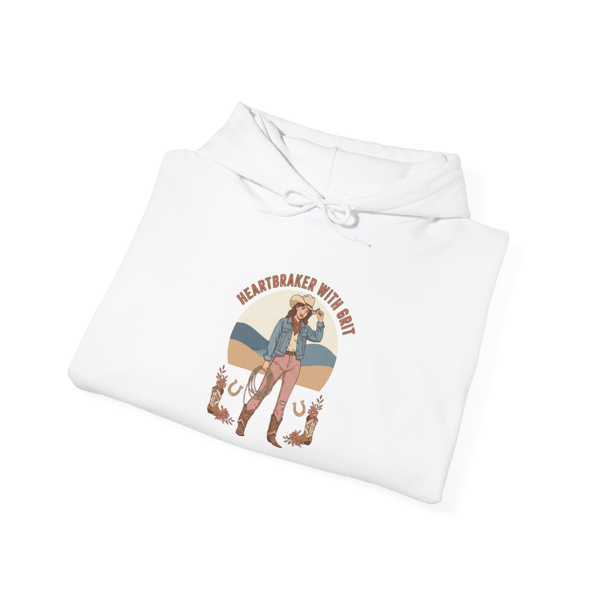 Dusty-rose and denim-blue western motifs meet playful grit in a wearable nod to the Western Cowgirl Valentine trend. A compact badge-style artwork blends a bandana pattern, rope heart and classic boot silhouette in distressed, vintage-block styling—subtle enough for everyday wear yet clearly cowgirl-inspired. The low-key placement and soft palette make this hoodie an easy layer for country-core outfits and chilly evening rides.