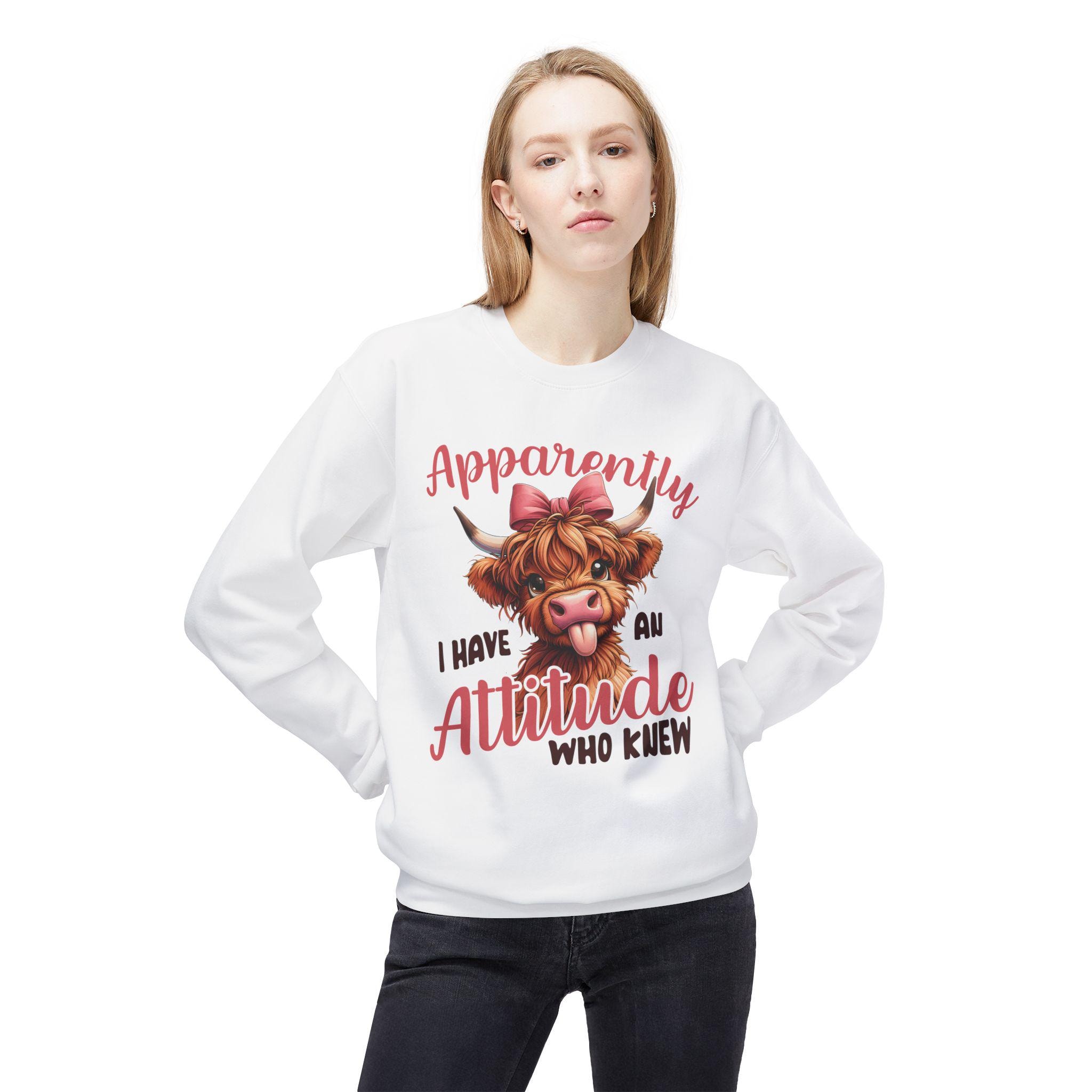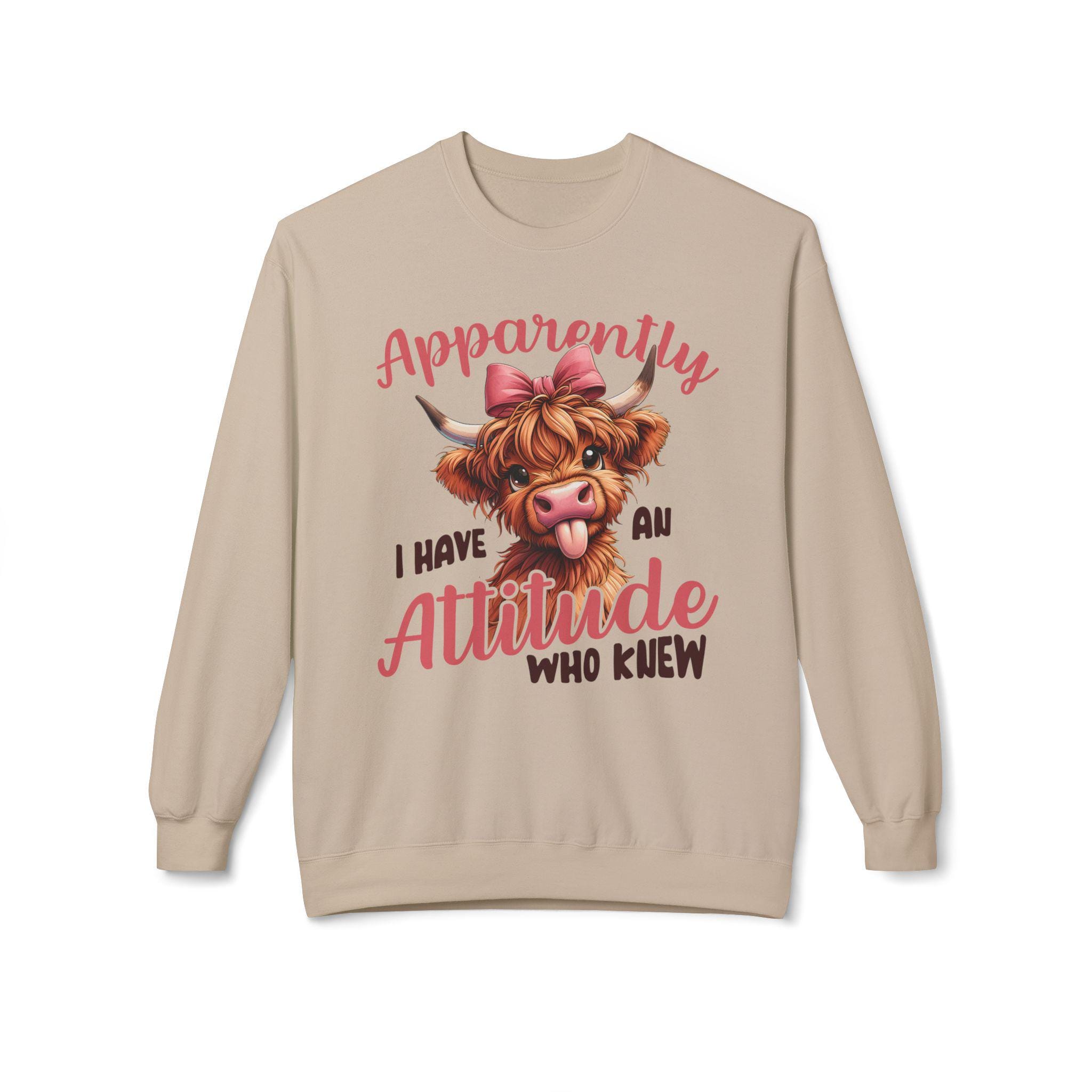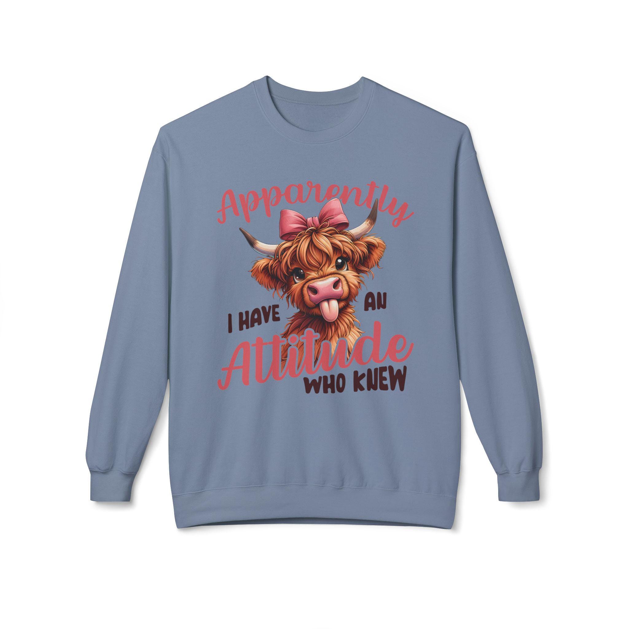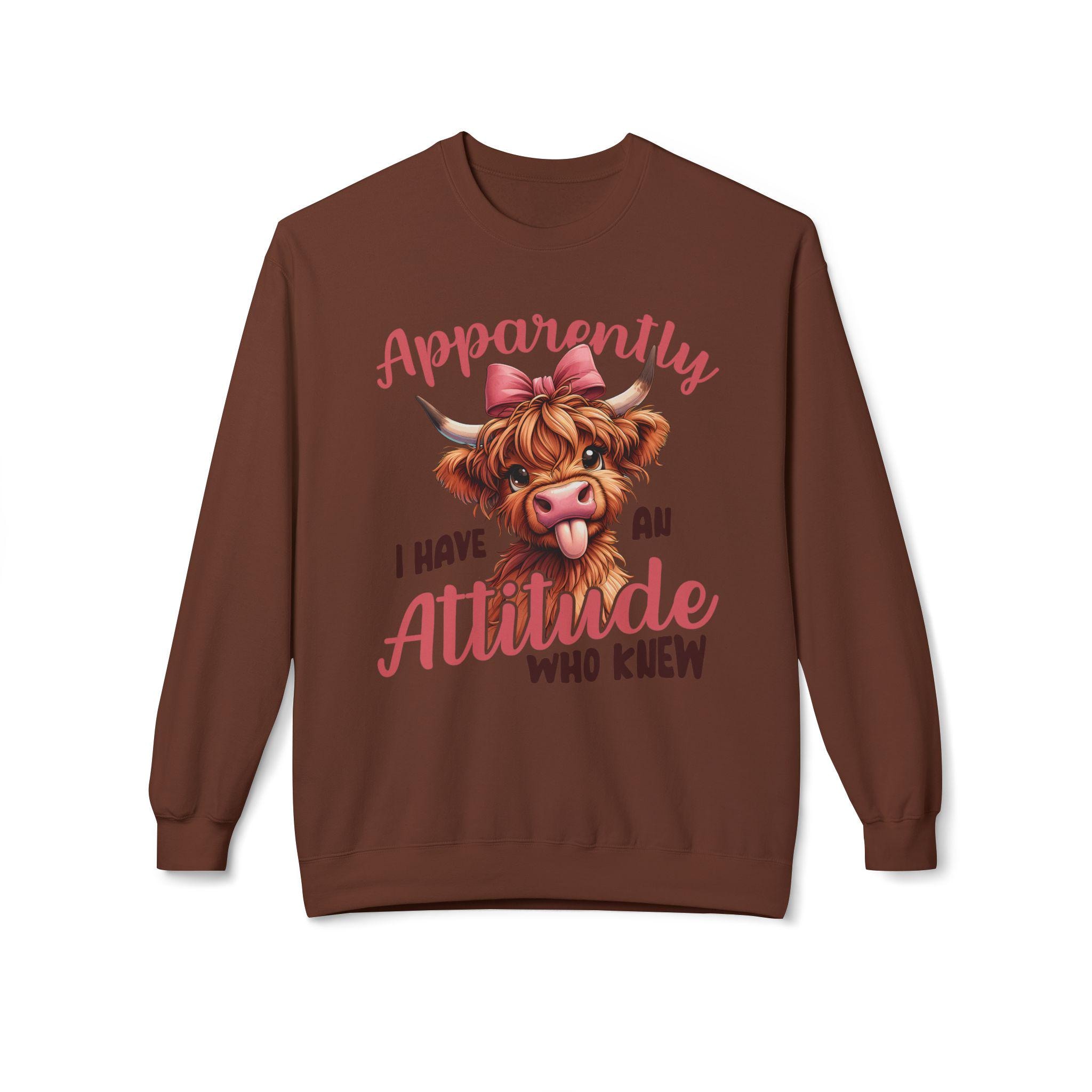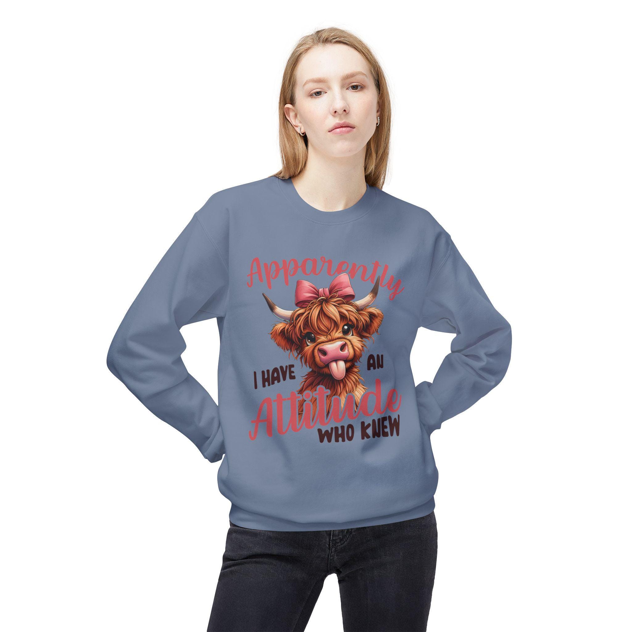 This midweight crewneck brings playful attitude to everyday wear. A cheeky Highland cow portrait — complete with a bow and tongue-out expression — sits above hand-lettered text that reads, "Apparently I have an attitude who knew." The relaxed, dropped-shoulder silhouette and medium-heavy fabric create a cozy, lived-in feel that layers easily over tees or under jackets. Wear it for slow mornings on the porch, casual meetups with friends, or low-key errands when you want your sense of humor to lead the conversation. The soft ring-spun cotton blend keeps the print vivid while staying comfortable through repeated wear and washes.